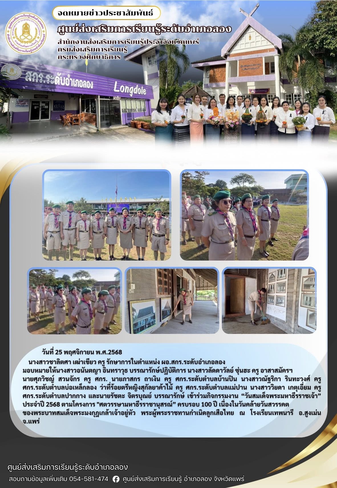 นางสาวชาลิตศา เฒ่าเขียว ครู รักษาการในตำแหน่ง ผอ.สกร.ระดับอำเภอลอง มอบหมายให้ นายภาสกร ถาเงิน ครู ศกร.ระดับตำบลบ้านปิน  เข้าร่วมกิจกรรมงาน “วันสมเด็จพระมหาธีรราชเจ้า” ประจำปี 2568 ตามโครงการ “ศตวรรษามหาธีรราชานุสรณ์” ครบรอบ 100 ปี เนื่องในวันคล้ายวันสวรรคต ของพระบาทสมเด็จพระมงกุฎเกล้าเจ้าอยู่หัว พระผู้พระราชทานกำเนิดลูกเสือไทย ณ โรงเรียนเทพนารี อ.สูงเม่น จ.แพร่
