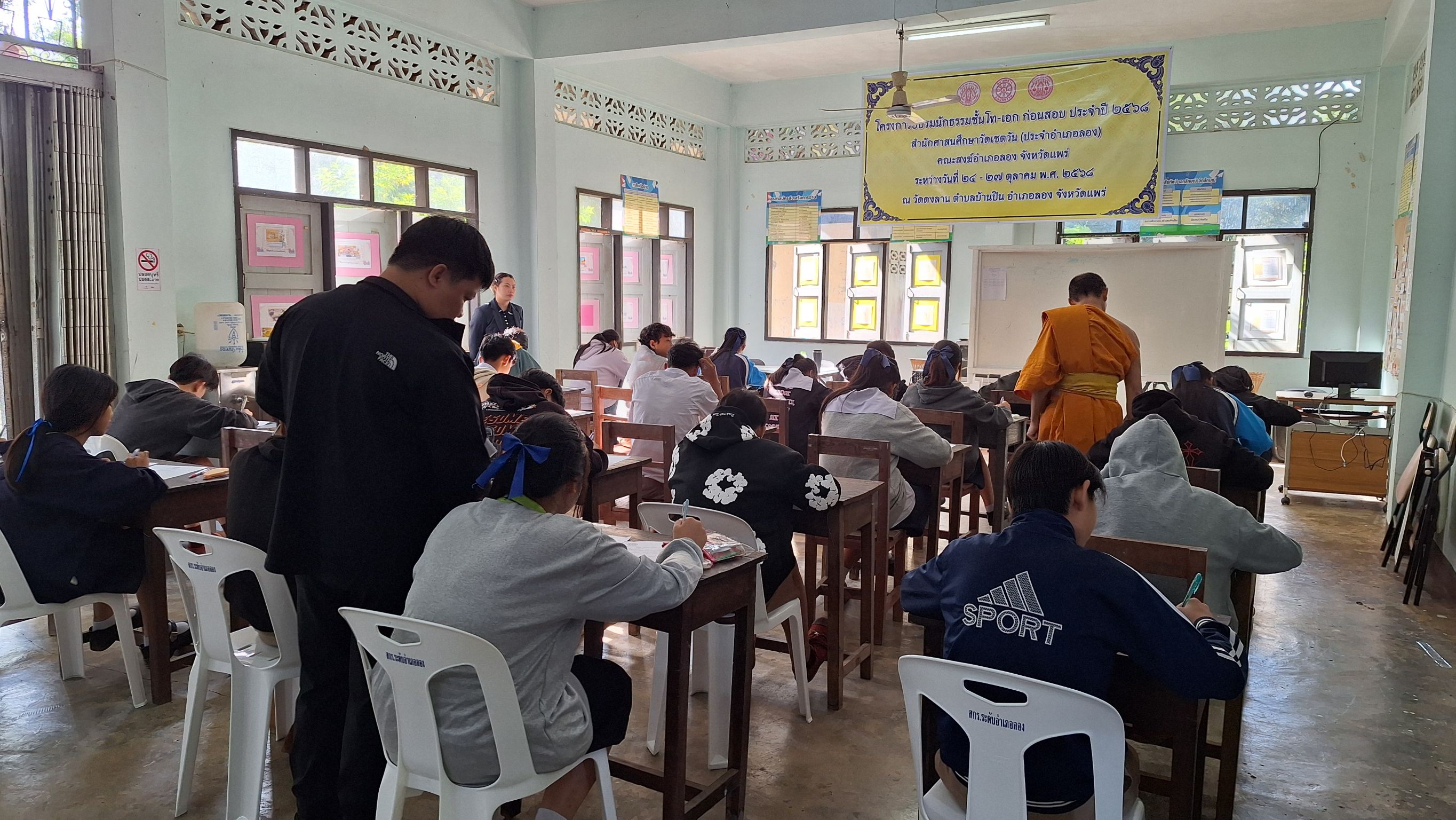 นางสาวชาลิตศา เฒ่าเขียว ครู รักษาการในตำแหน่ง ผอ.สกร.ระดับอำเภอลอง มอบหมายให้ นายภาสกร ถาเงิน ครู ศกร.ระดับตำบลบ้านปิน ร่วมกับ สำนักศาสนศึกษาวัดดงลาน จัดกิจกรรมตามโครงการธรรมศึกษาในสถานศึกษา ประจำปี 2568 กิจกรรมการสอบธรรมศึกษา ฯ ในวันที่ 27 พฤศจิกายน 2568 โดยมีพระครูโสภิตโพธานุรักษ์ รองเจ้าคณะตำบลบ้านปิน และเจ้าคณะพระสังฆาธิการ ร่วมเป็นเกียรติในการเปิดการสอบธรรมศึกษา ประจำปี 2568 สถานที่ วัดดงาลาน /ศกร.ระดับตำบลบ้านปิน