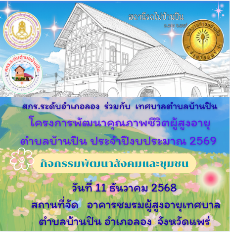 นางสาวชาลิตศา เฒ่าเขียว ครู รักษาการในตำแหน่ง ผอ.สกร.ระดับอำเภอลอง มอบหมายให้นายภาสกร ถาเงิน ครู ศูนย์การเรียนรู้ ร่วมกิจกรรมตามโครงการพัฒนาคุณภาพชีวิตผู้สูงอายุตำบลบ้านปิน ประจำปีงบประมาณ 2569 (กิจกรรมพัฒนาสังคมและชุมชนการสำรวจแหล่งเรียนรู้ภูมิปัญญาท้องถิ่น) โดยการนำของ นายสมศักดิ์ วงค์หลวง นายกเทศมนตรีตำบลบ้านปิน และนางสาวเปรมยุตา อินทรโกศล นักพัฒนาชุมชน เทศบาลตำบลบ้านปิน มีผู้เข้าร่วมกิจกรรม จำนวน 30 คน สถานที่ ชมรมผู้สูงอายุเทศบาลตำบลบ้านปิน ตำบลบ้านปิน อำเภอลอง จังหวัดแพร่