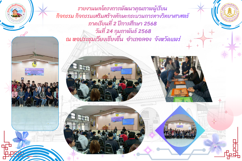 นางสาวชาลิตศา เฒ่าเขียว ครู รักษาการในตำแหน่ง ผอ.สกร.ระดับอำเภอลอง มอบหมายให้นายภาสกร ถาเงิน ครู ศูนย์การเรียนรู้ระดับตำบลบ้านปิน นำนักศึกษาเข้าร่วมโครงการพัฒนาคุณภาพผู้เรียน กิจกรรมเสริมสร้างทักษะกระบวนการทางวิทยาศาสตร์ ภาคเรียนที่ 2 ปีการศึกษา 2568 วันที่ 24 กุมภาพันธ์ 2568ณ หอประชุมเวียงเชียงชื่น อำเภอลอง จังหวัดแพร่